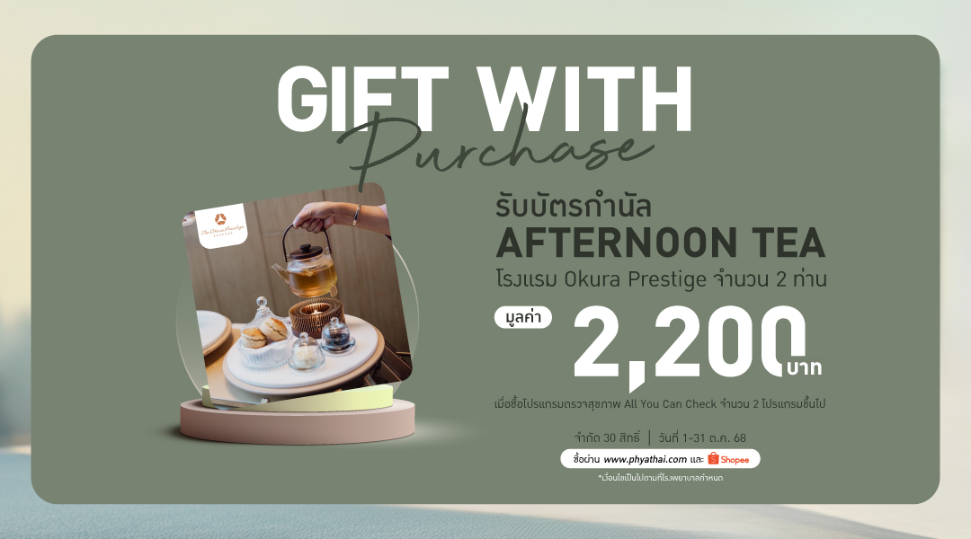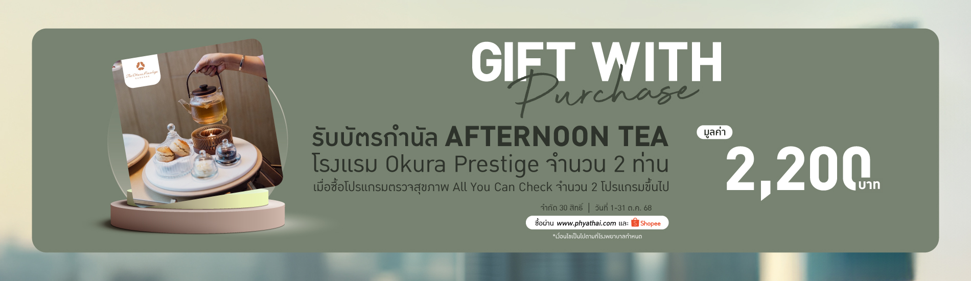 1. เมื่อซื้อโปรแกรมในแคมเปญ All You Can Check จำนวน 2 แพ็กเกจขึ้นไป รับบัตรกำนัล Afternoon Tea โรงแรม Okura Prestige จำนวน 2 ท่าน มูลค่า 2,200 บาท (จำกัด 30 สิทธิ์แรกที่ลงทะเบียน)