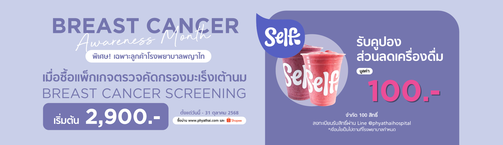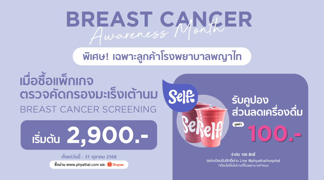 1. เมื่อซื้อแพ็กเกจ Breast Cancer Screening รับคูปองส่วนลดเครื่องดื่ม Self มูลค่า 100 บาท (จำกัด 100 สิทธิ์แรกที่ลงทะเบียน)